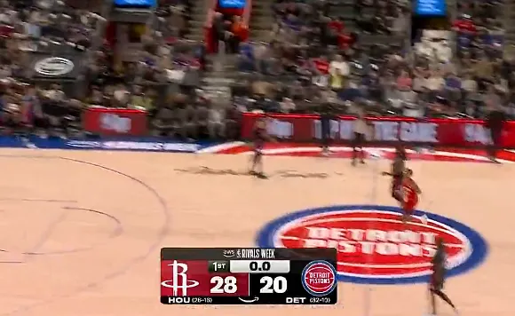 比赛的第一节,史密斯中圈超远三分不中,火箭首节28-20领先活塞。