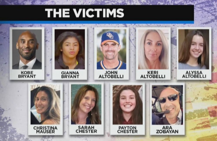 2020年1月26日直升机失事中的九位遇难者包括:科比与其女儿吉安娜;前布鲁斯特白帽队主帅约翰-阿尔托贝利及其妻子Kerith、女儿Alyssa;小学女子篮球队教练Christina Mauser;飞行员Ara Zobayan;吉安娜的队友佩顿-切斯特(13岁),以及佩顿的母亲萨拉-切斯特。